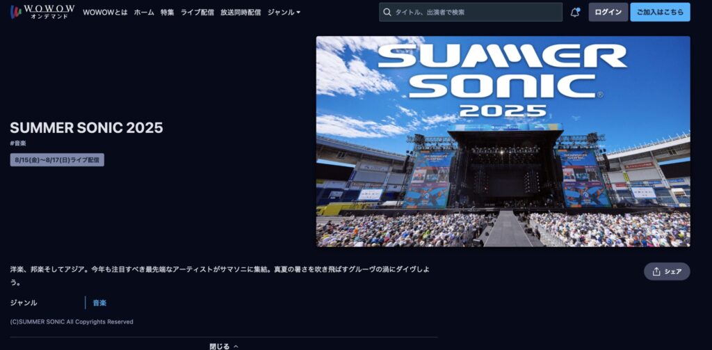 WOWOWには放送版もありますが、放送版ではサマソニの放送はなく、ネット配信版のWOWOWオンデマンドでのみ視聴できます。